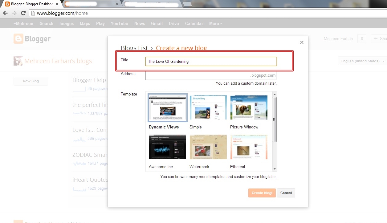 Once you sign in, on Blogger home screen, click on "New Blog" button as shown in the figure below. (Click on the image to open and enlarge)Step 2: Blog Title
