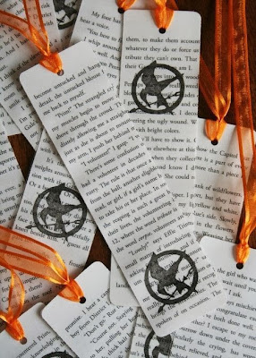 Are you a Hunger Games fan? Cut out paper strips from an old book and back it up with a thick paper or a light cardboard for support. You can either draw anything symbolic to the Hunger Games, like a mockingjay, or you can use a stamp. Add a ribbon for color.18